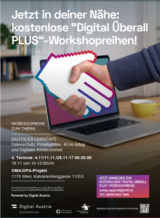- Wien: „Digitales Lerncafé“ vier findet jeweils am Mittwoch vormittags von 10:00 bis 13:00 in der Kalvarienberggasse 11/EG statt